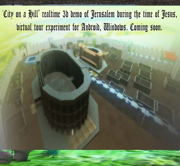 Created by Matthew L. Hornbostel, likely to see a release as a small free program in Windows .exe and Android .apk format. Tour will have 3d rendered scenes to freely look around in, about a dozen 360-degree views of various points of note in and around Jerusalem at the time of Christ.
